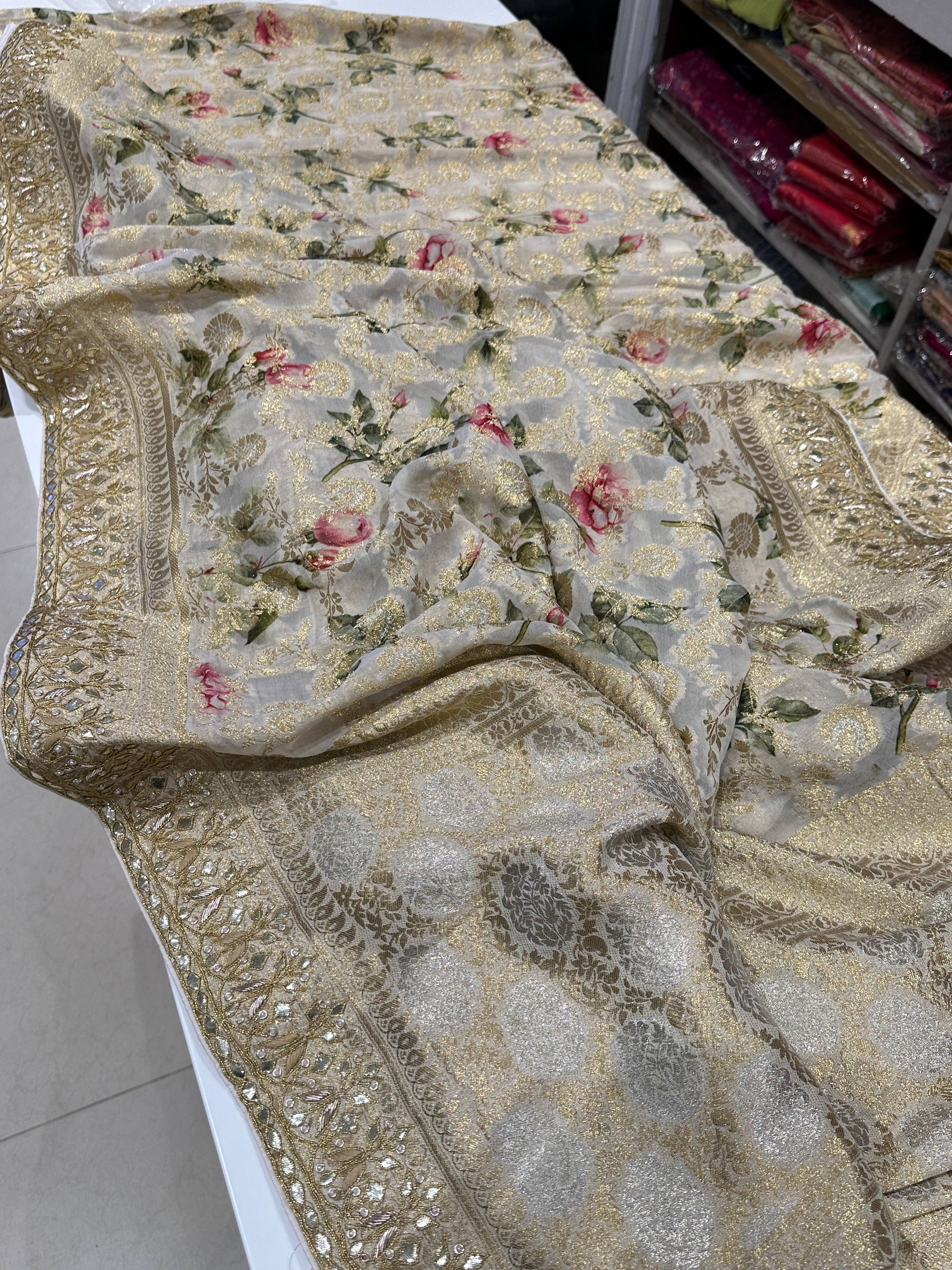 White Meenakari Banarasi Kora Sequin Zardosi Hand Embroidery Saree