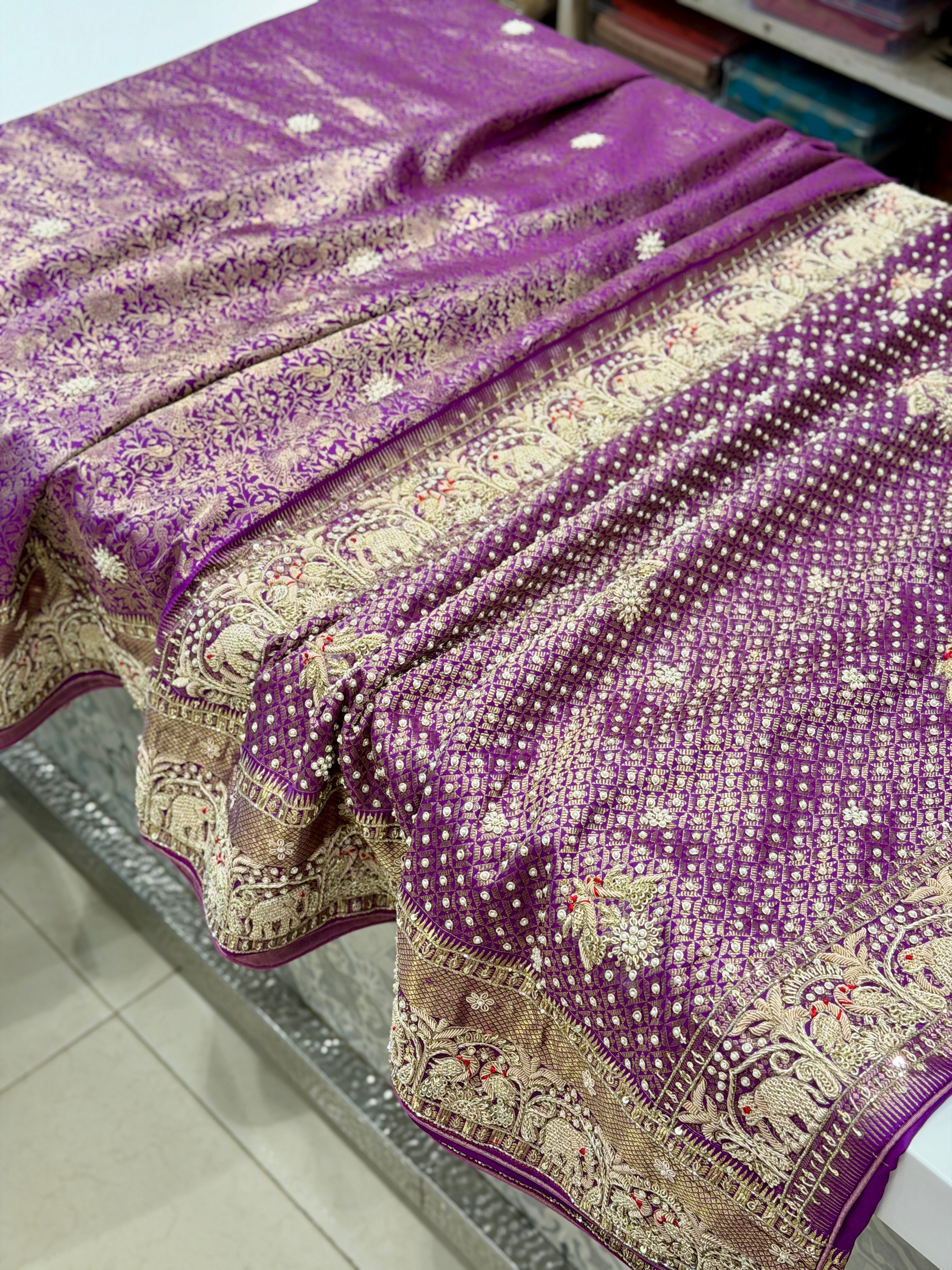 Violet Patola Ratan Chowk Kidiya Moti Hand Embroidery Saree