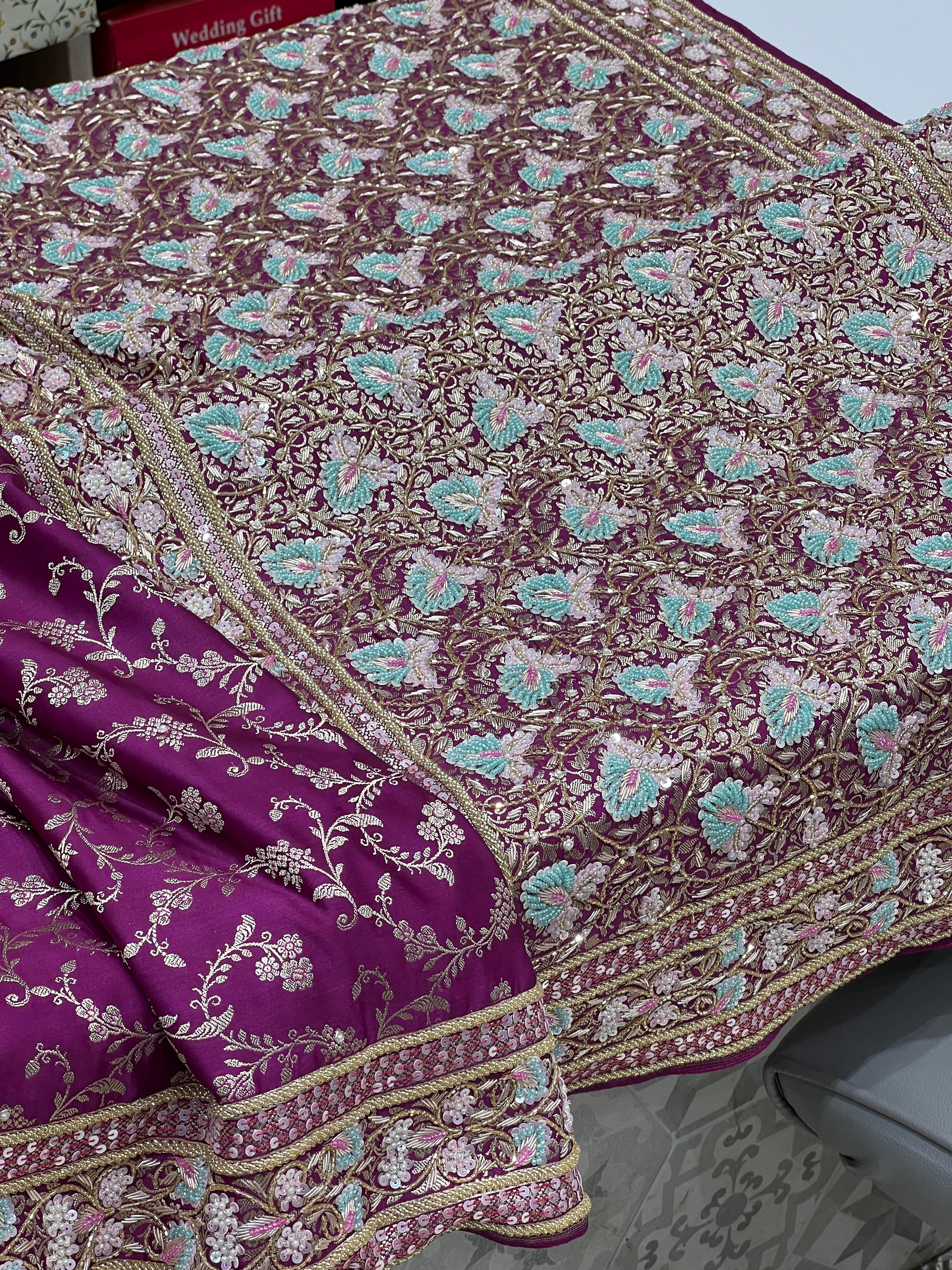 Wine Banarasi Silk Fancy Hand Embroidery Saree